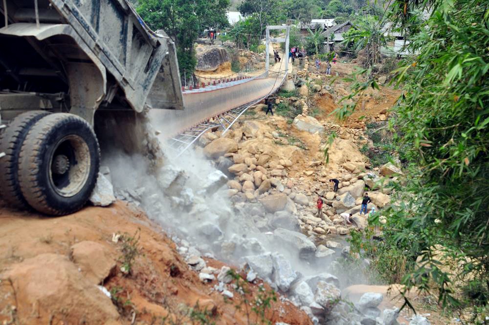 Liên tiếp những xe chở đá đổ xuống để chuẩn bị vật liệu thi công.