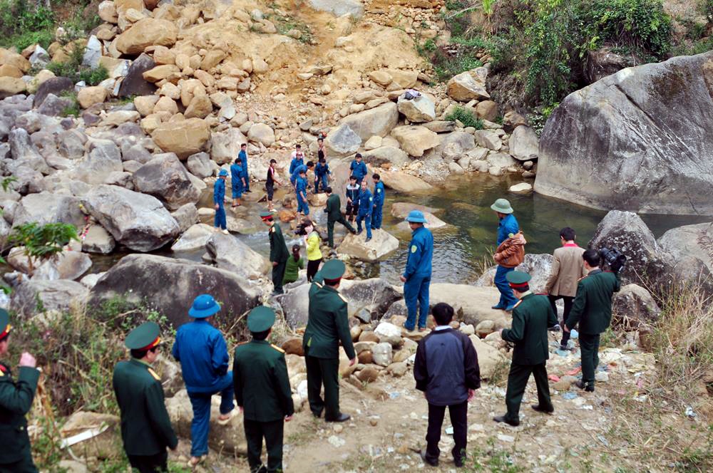 Lực lượng dân quân tự vệ xã Sơn Bình dưới sự chỉ đạo của Công an huyện Tam Đường xuống khảo sát và trình bày các phương án tối ưu nhất khi bắc cầu tạm.