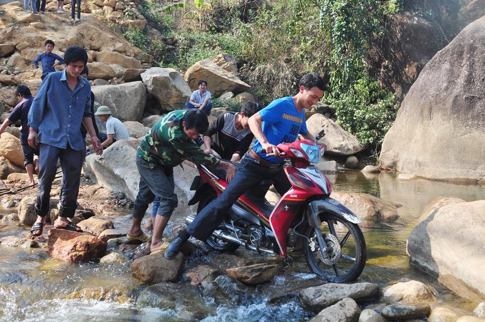 Trong lúc này, người dân vẫn qua suối bằng cách nhấc bổng mọi thứ, kể cả xe máy để mang theo.