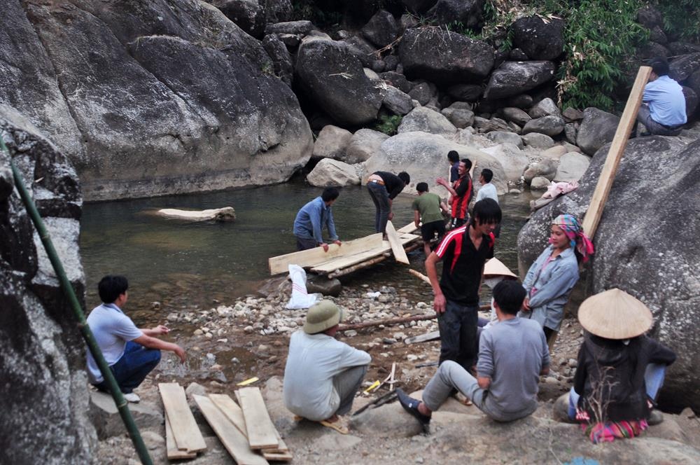Chuẩn bị lắp cầu ván gỗ cho người dân đi qua suối trong thời gian thi công cầu tạm.