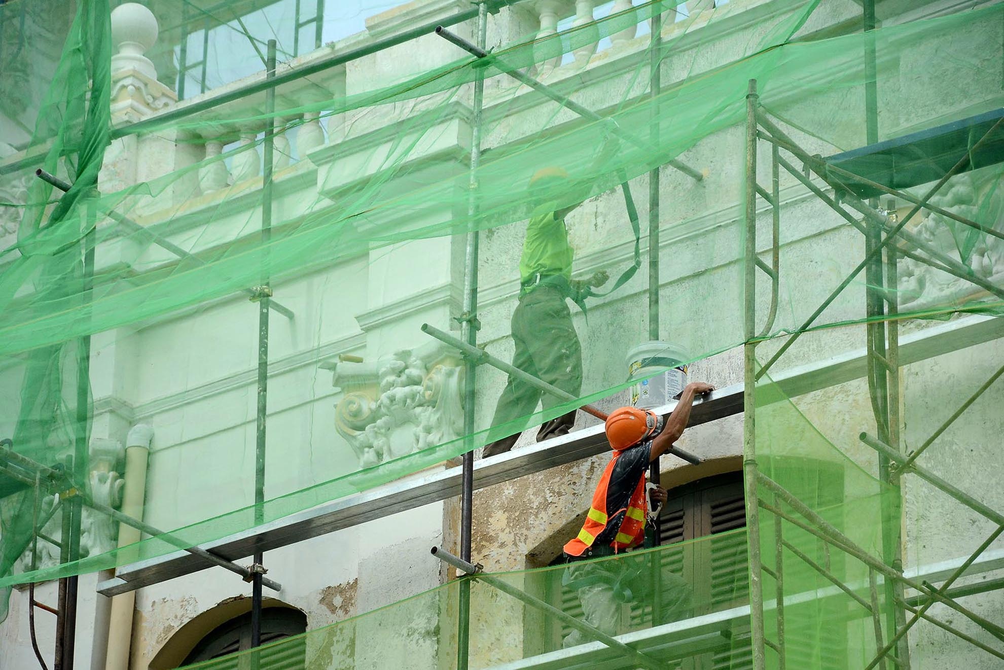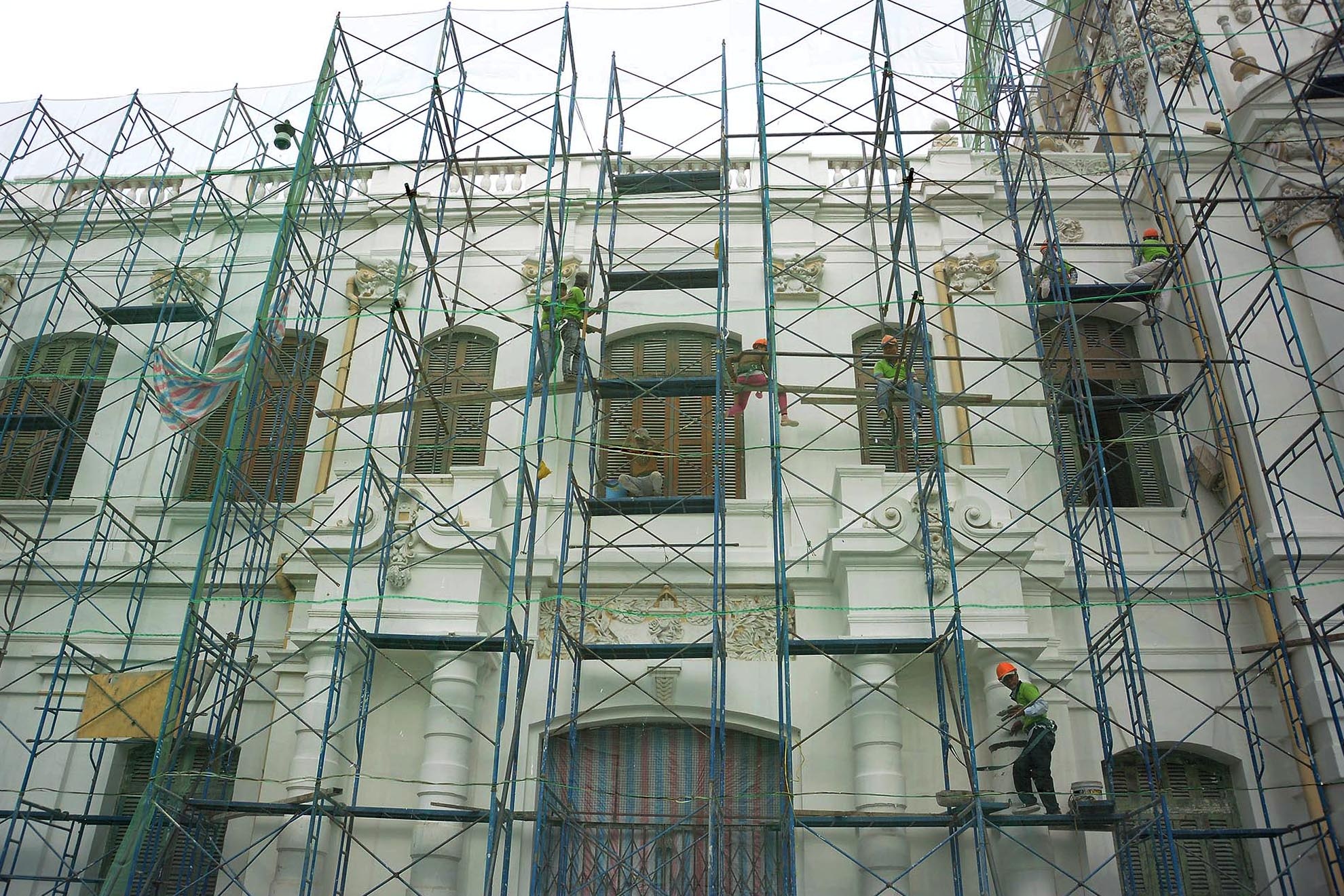 Cùng với việc lát đá mặt đường, đơn vị thi công cũng đang gấp rút trùng tu tòa nhà trụ sở UBND TP.HCM.