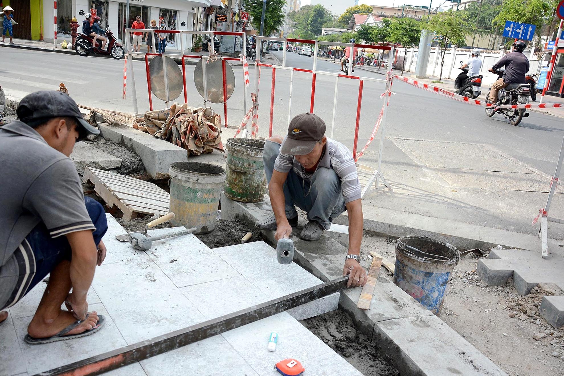 Công nhân đang gấp rút hoàn thành việc lát những viên gạch cuối cùng trên vỉa hè tại giao lộ Lê Thánh Tôn - Pasteur, quận 1.