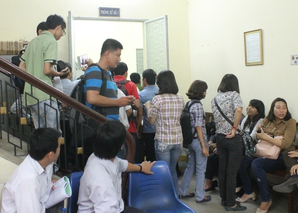 | Phiên tòa diễn ra trong phòng xử chỉ chừng 10m2 nên các phóng viên phải tác nghiệp rất vất vả từ bên ngoài. |