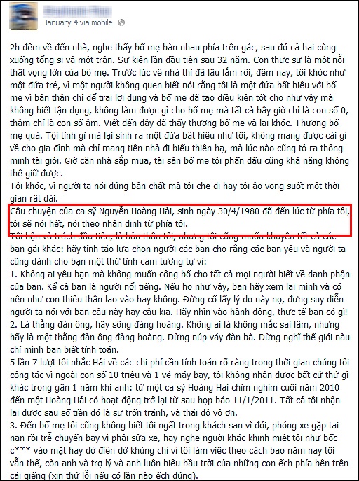Tôi ngậm bồ hòn đến tận ngày hôm nay với cái kiêu làm viêc cảm xúc, nói nặng lời là giận dỗi, nói phật ý là chiến tranh lạnh. Ai đó đã đi với tôi mấy vòng xe ô tô quanh Hà Nội chỉ để nói tôi một câu: anh muốn hát 4-5 năm nữa. Em trợ lý đó, đã từng tự tử. Anh phải đấm tay vào cửa kính để đưa đi cấp cứu. Ai đó nói tôi rằng: Em hãy biết chuyện vậy, đừng nói với ai. Tôi đã im lăng suốt một thời gian dài và chịu các thể loại cảm tính vì câu nói này. Hy vọng nếu biết thông tin này tại đây, làm ơn làm chủ cảm xúc bản thân, đưng vì tức giận viêc tôi nêu ra trên này mà làm những hành động dại dột để suốt đời tôi mang tiếng ác: reo họa/ điêu ngoa dồn ép thằng bé đến mức tự tử!!!