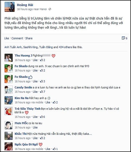 Ngay sau đó, trên trang cá nhân của mình, Hoàng Hải viết: "Phải sống bằng lý trí, lương tâm và chân lý! Một nửa của sự thật chưa hẳn đã là sự thật. Nếu đã không thể sống thỏa cho lòng nhiều người thì chỉ có thể sống đúng với lương tâm, sống không thẹn với lòng! Và tôi luôn tự hào!".