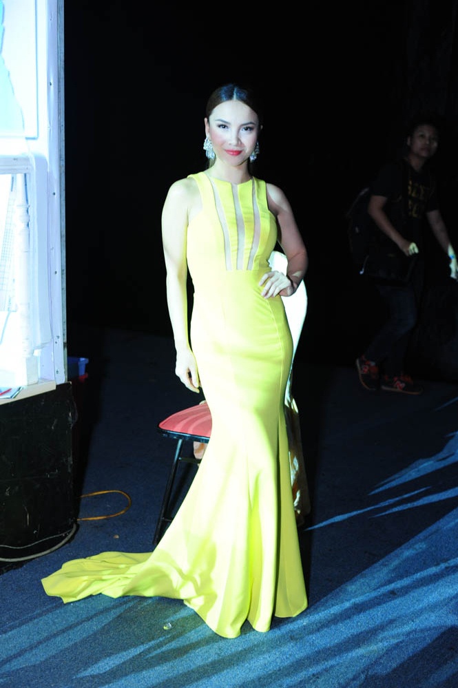 | MC Yến Trang diện chiếc váy đuôi cá màu vàng chanh rất quyến rũ. |