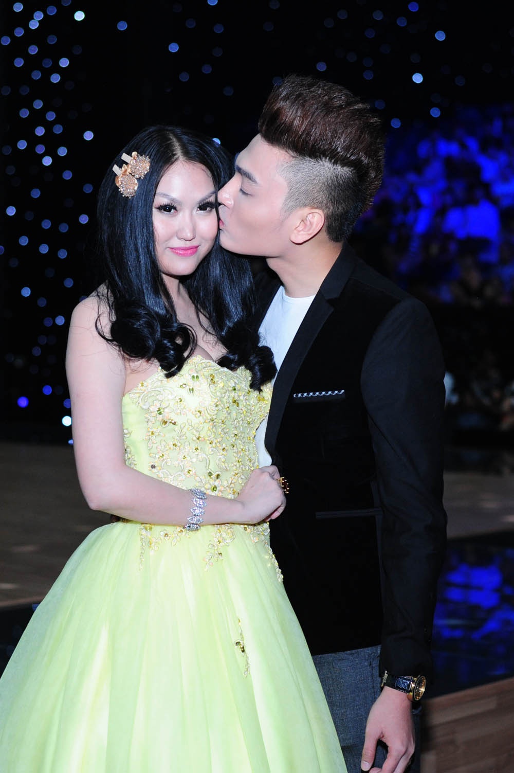 | Cùng có mặt trên hàng ghế khán giả của liveshow 8 chương trình BNHV, bạn trai tin đồn tặng Phi Thanh Vân một nụ hôn ngọt ngào lên má khi thấy các phóng viên chú ý tới họ. |