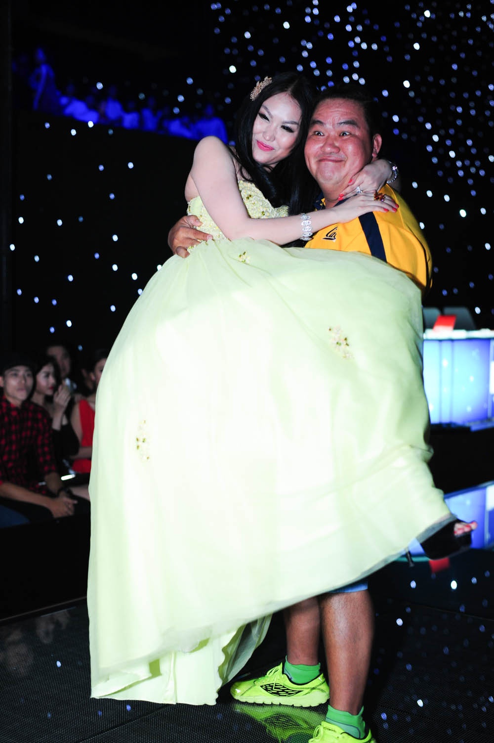 | Cao hứng, Hoàng Mập còn bế bổng Phi Thanh Vân lên. |