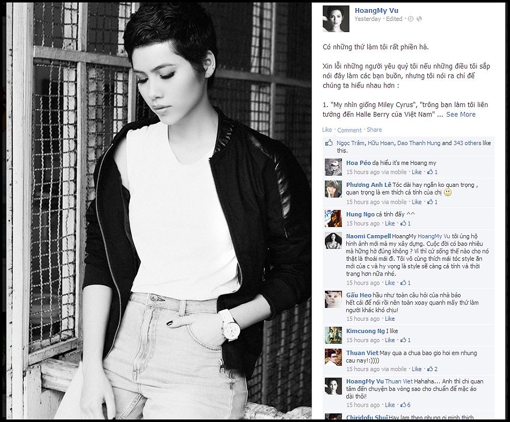 Bên cạnh đó, trong bức "tâm thư" mà Hoàng My chia sẻ trên trang cá nhân, cô cũng phân trần về chuyện nổi loạn hay nghi án "nhái hình ảnh" của Miley Cyrus và Halle Berry... Cô cho biết: "Nếu tôi đi theo số đông, có lẽ tôi nên giữ một hình ảnh trong sáng dễ chịu. Nhưng tôi thích đi theo số "chất". Nghĩa là tôi muốn làm bạn với những người thích cái "chất" và có cái "chất". Vấn đề là các bạn cảm thấy thế nào, đừng quan tâm đến người khác cảm thấy thế nào".