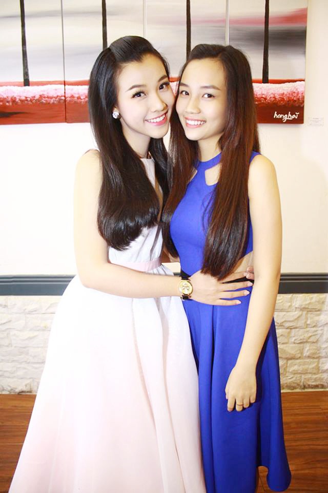 | Tháp tùng Hoàng Oanh trong sự kiện này là cô em gái Hoàng Dung. Kém chị 4 tuổi, Hoàng Dung tỏ ra nhí nhảnh và hồn nhiên khi hôn nhẹ lên má Hoàng Oanh. |