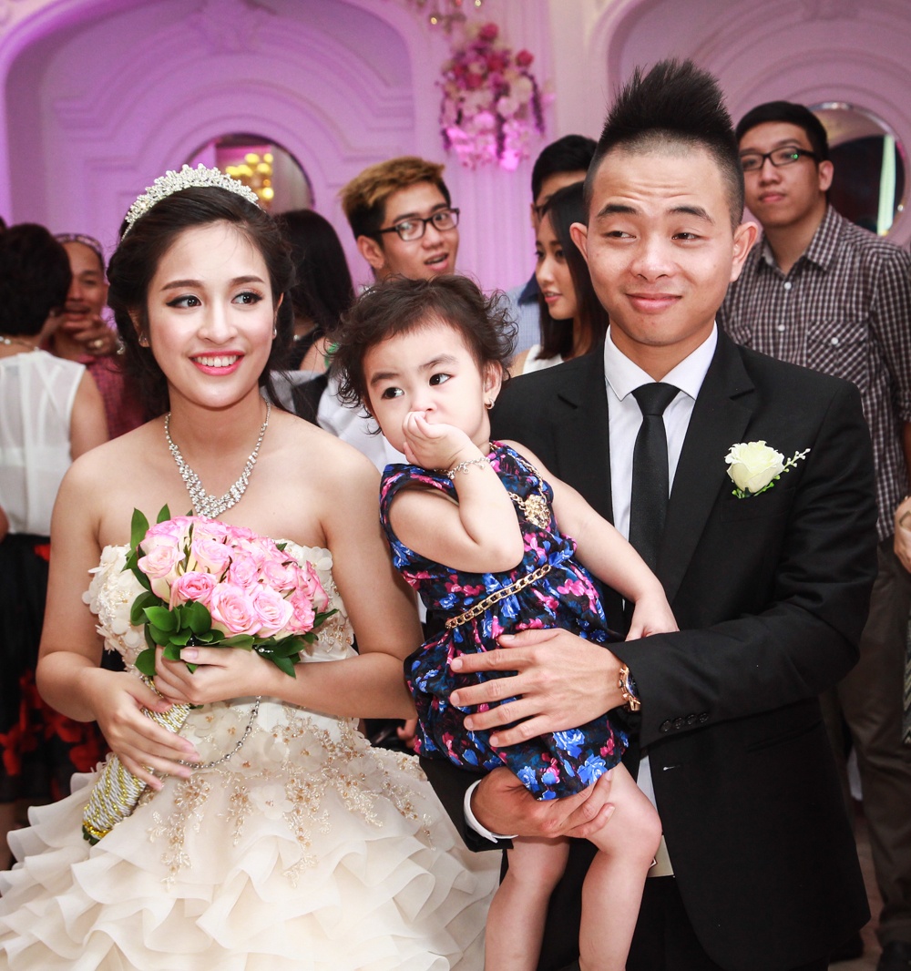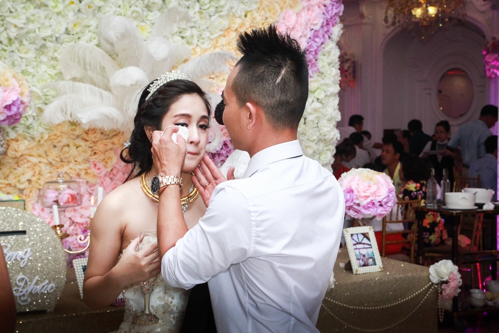 | Cô dâu xúc động trong ngày trọng đại. Nam ca sĩ tỏ ra bối rối, nhanh chóng lau nước mắt cho bạn đời. |