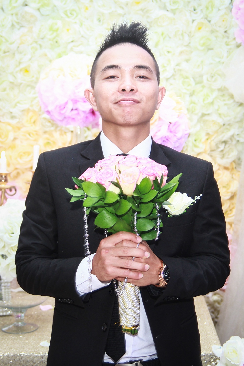 | Nam ca sĩ tay cầm hoa, hồi hộp chờ cô dâu tiến vào lễ đường. |
