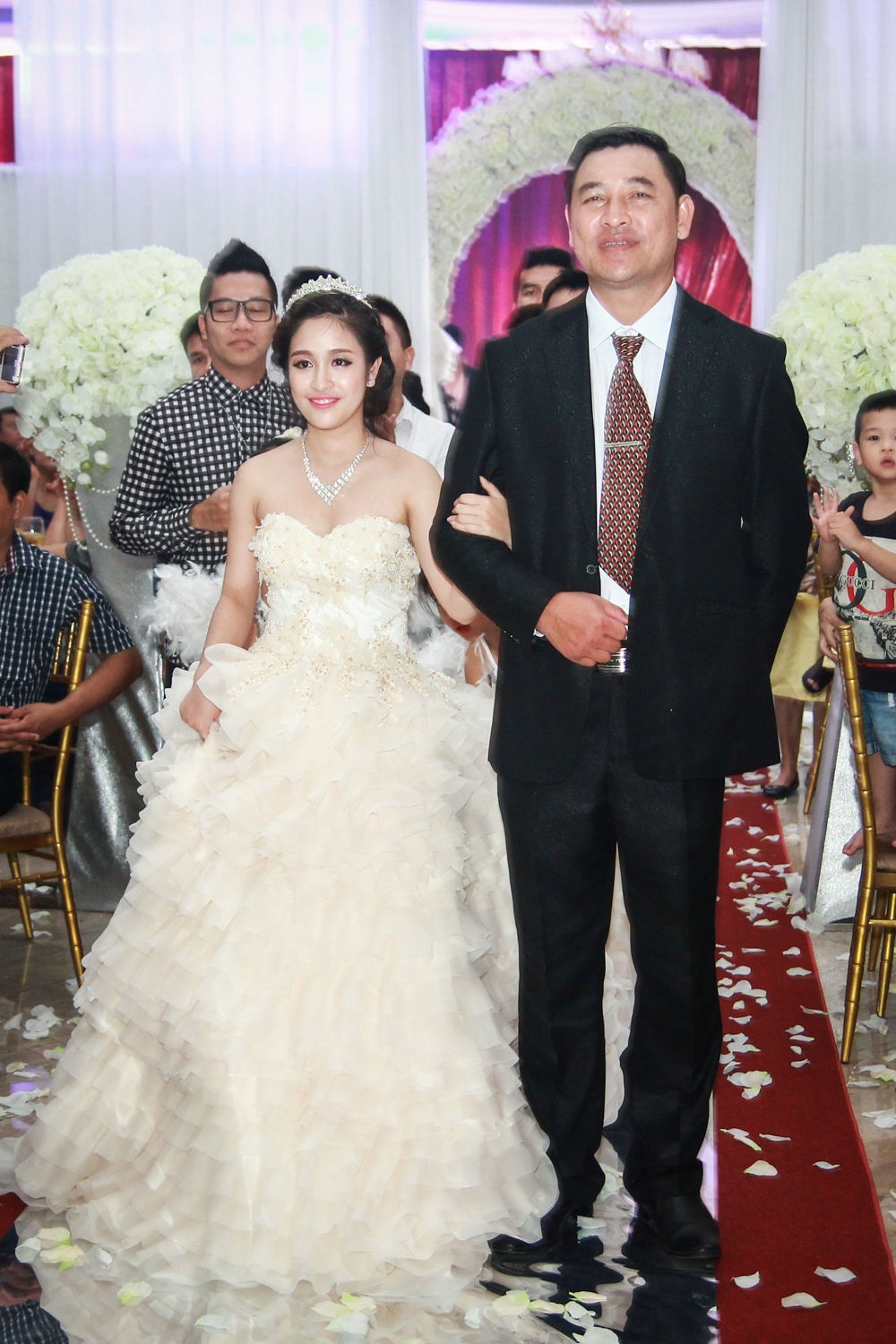 | Hồng Anh khoác tay bố bước vào trong sự chờ đợi của chồng sắp cưới và những quan khách có mặt. |