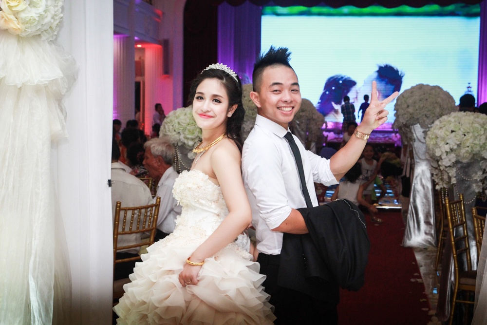 | Cặp đôi tạo dáng nhí nhảnh sau khi lễ cưới kết thúc. |