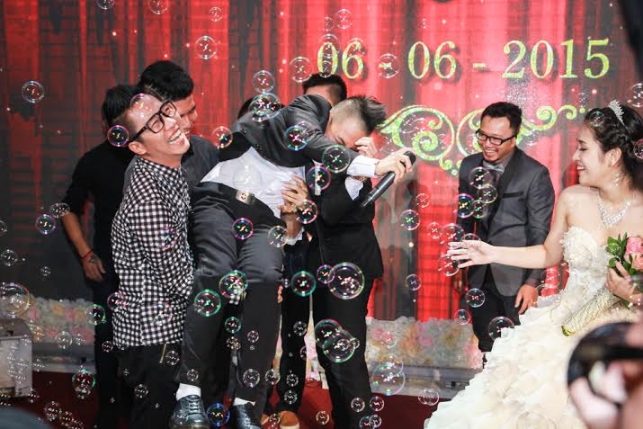 Hôm nay (6/6), Phúc Bồ và bạn gái hot girl chính thức nên duyên vợ chồng. Trong đám cưới, do quá phấn khích, Hoàng Rapper đã bế chú rể lên trước sự chứng kiến của mọi người.