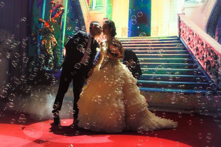 | Phúc Bồ trao nhẫn cho cô dâu trong khung cảnh tràn ngập bong bóng lãng mạn. |