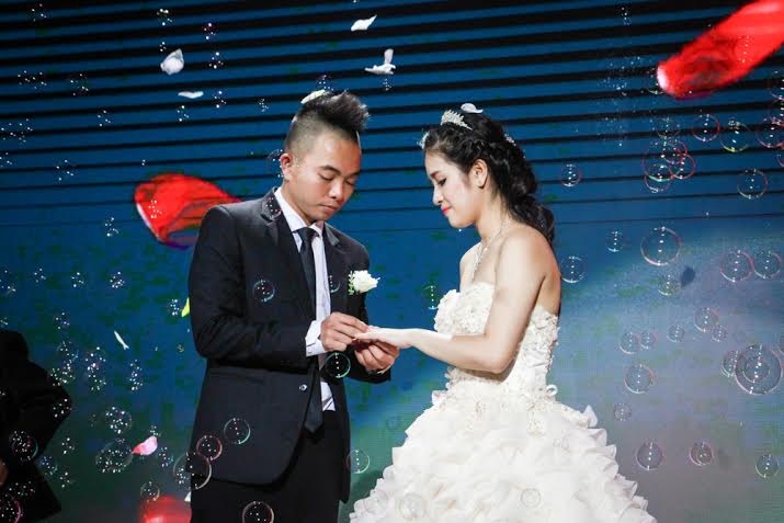 | Khi trông thấy vợ, chàng trai sinh năm 1987 ngay lập tức thể hiện ca khúc Cô dâu - do chính anh tự sáng tác, dành tặng riêng cho Hồng Anh. |