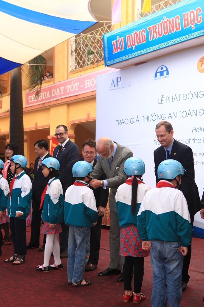 Trong bầu không khí ấm cúng tại buổi lễ, Hoàng tử Michael cùng các đại diện đã trao tặng mũ bảo hiểm cho các em học sinh để thể hiện sự cam kết và ủng hộ dự án Mũ bảo hiểm cho trẻ em. Tiếp đó, các em học sinh được cán bộ dự án của Quỹ AIP hướng dẫn đội mũ bảo hiểm đúng cách để đảm bảo an toàn.
