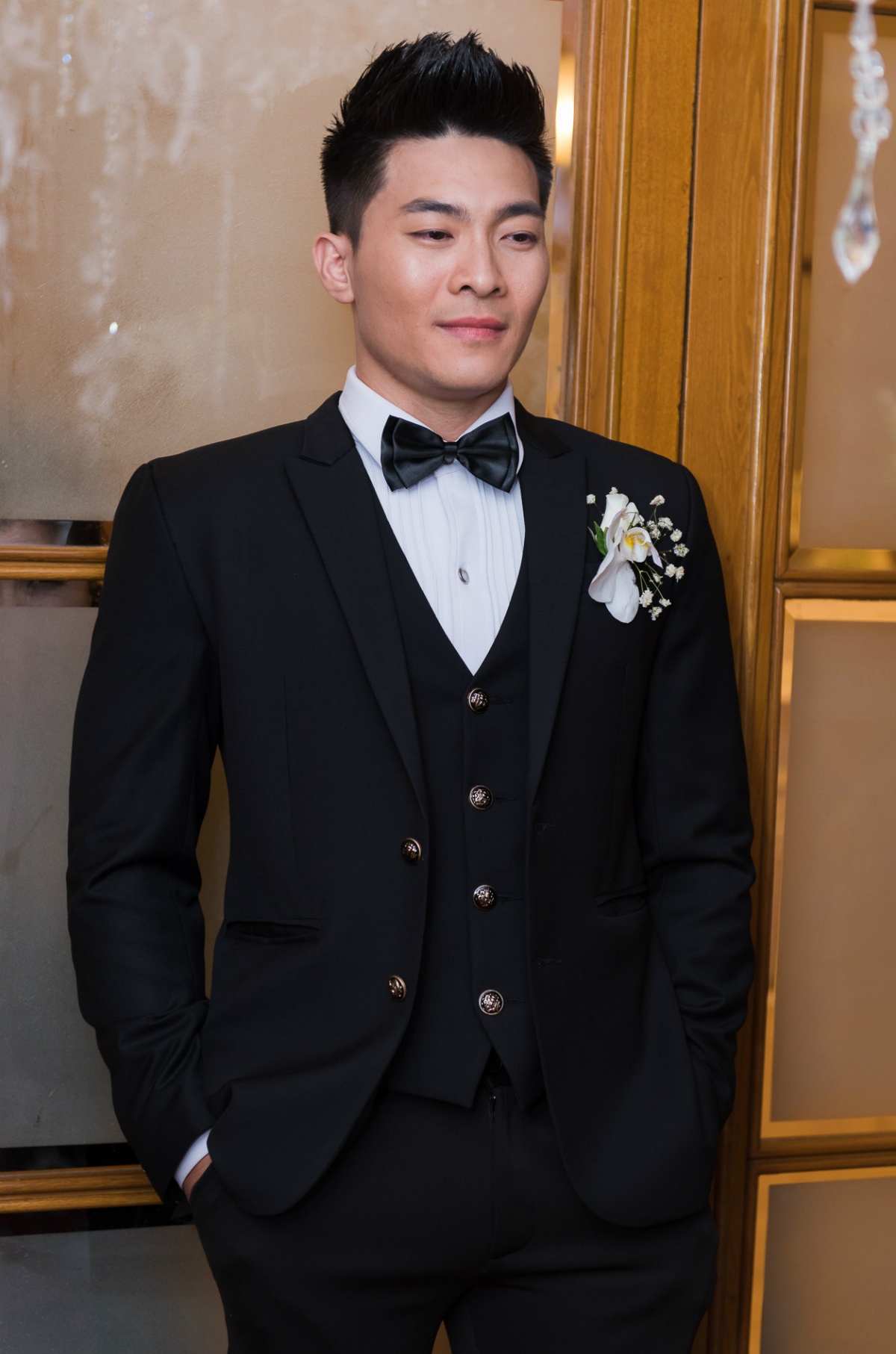 Quốc Nghiệp dẫn anh trai xuống đón cô dâu để cả 2 tiến hành các nghi lễ truyền thống. |