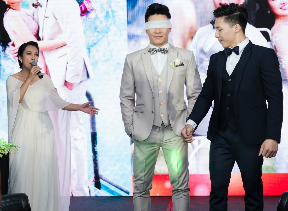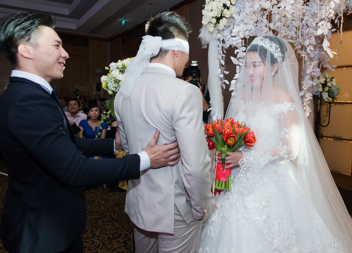 Phù rể bịt mắt chú rể và dắt tay anh bước xuống sân khấu. |