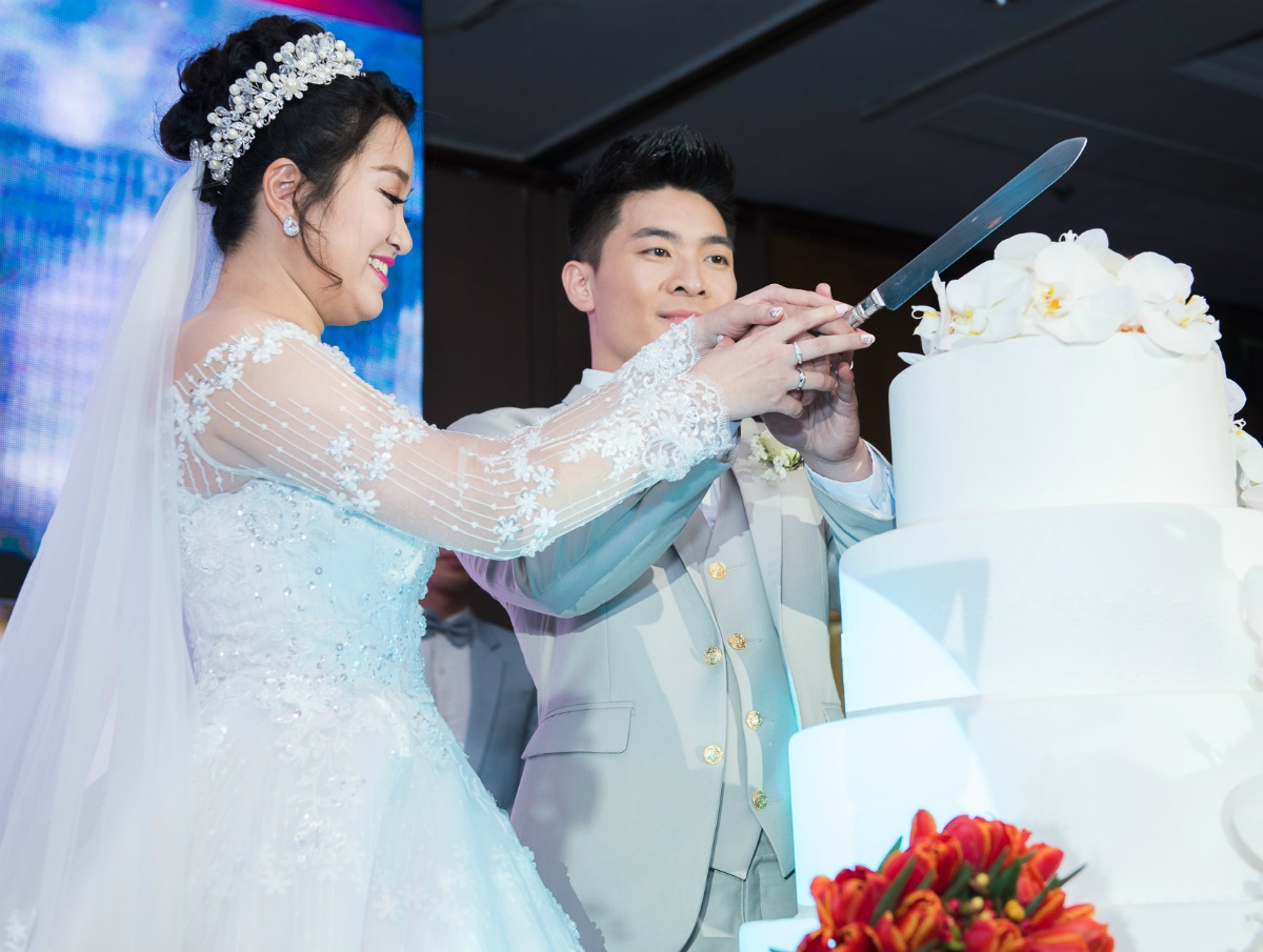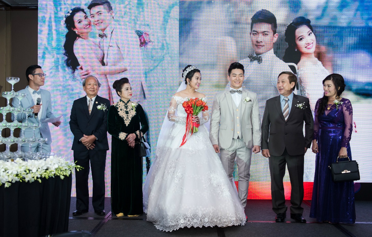 Cô dâu và chú rể mời bố mẹ 2 bên nâng ly chúc mừng. Sau khi thành hôn, cả 2 vẫn tiếp tục theo đuổi công việc. Quốc Cơ sẽ sang nước ngoài biểu diễn sau đám cưới. |