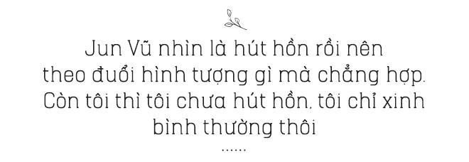 - Thì suy nghĩ mỗi đứa một khác. Jun Vũ là vì đẹp. Jun đẹp quá, đẹp cực kỳ luôn, đẹp đến nỗi tôi mê bạn ấy luôn. Với thực ra Jun Vũ nhìn một cái là thấy hút hồn rồi nên bạn ấy theo đuổi hình tượng gì mà chẳng hợp.