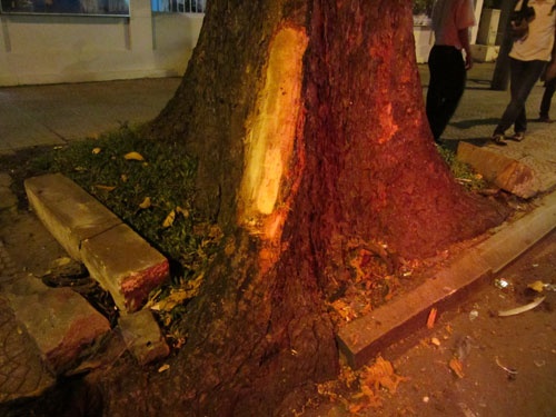 | Xe phóng với tốc độ nhanh và tránh ô tô đi cùng chiều nên đã lao vào gốc cây. |