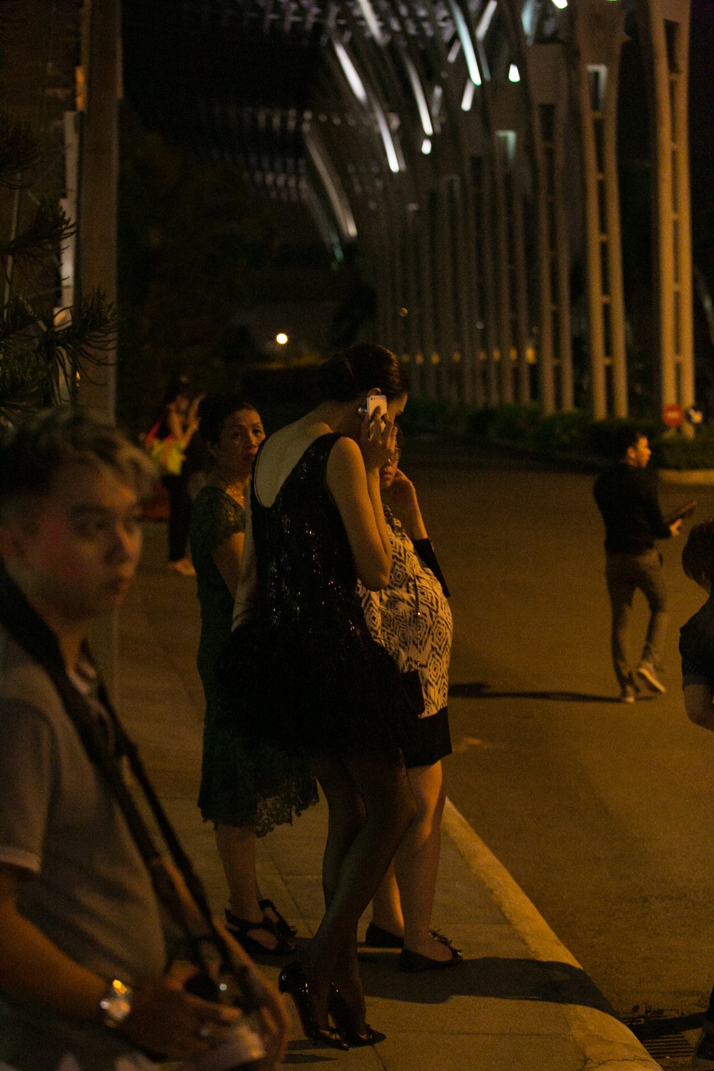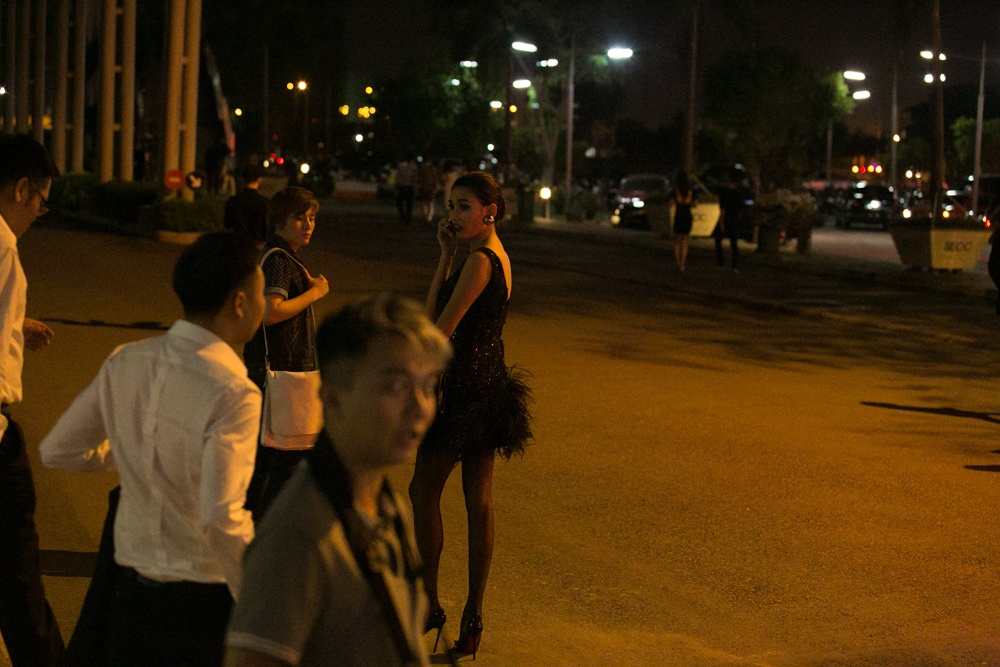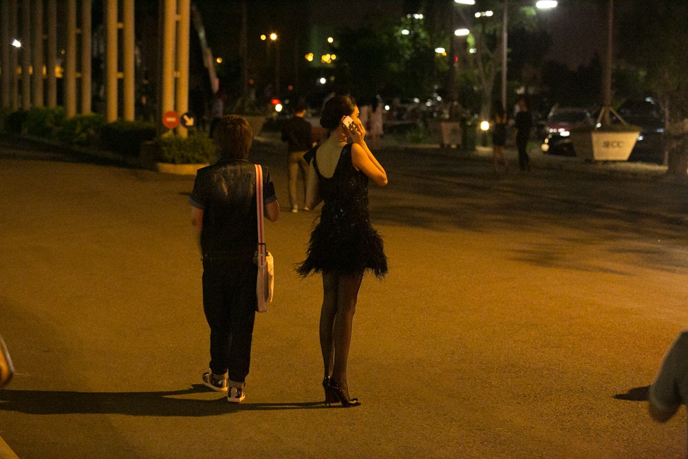 | Bạn bè đi trước gọi taxi còn Hoàng Yến chậm rãi đi phía sau vì đôi giày cao gót không cho phép cô đi nhanh. |