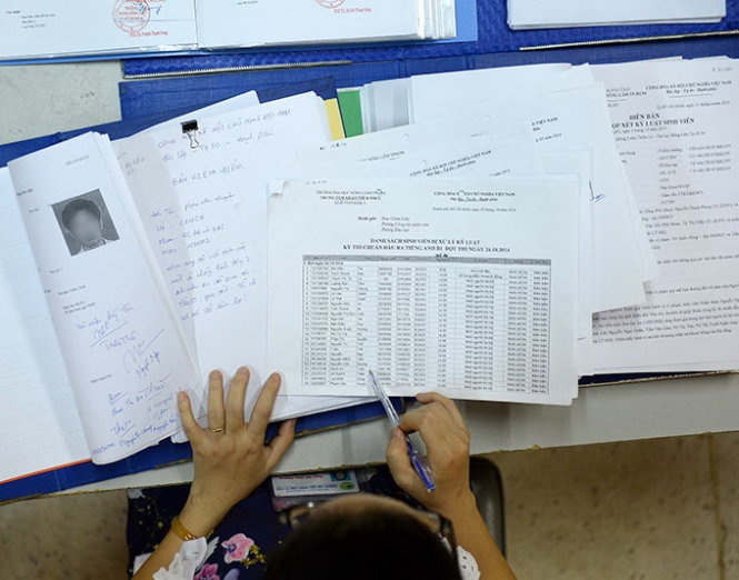 | Cán bộ ĐH Nông lâm TP HCM lập danh sách sinh viên thi hộ, nhờ thi hộ và tổ chức thi hộ để chuyển hồ sơ qua công an. Có những kỳ thi trường này phát hiện tới 30 trường hợp thi hộ. Ảnh: Tuổi Trẻ. |