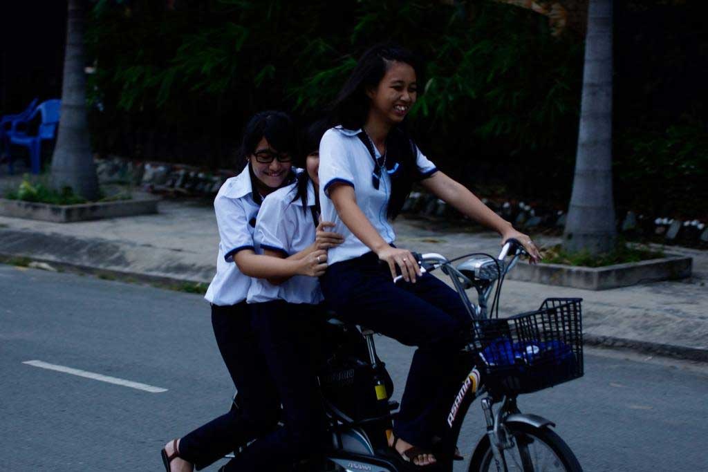 | Nữ sinh đi xe đạp điện dàn hàng và không đội mũ bảo hiểm. |