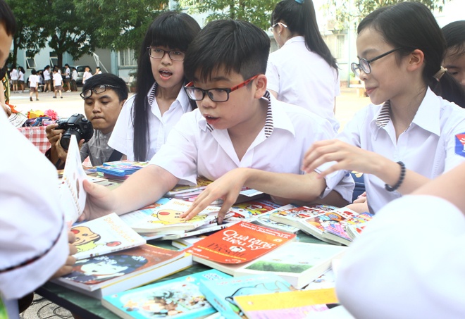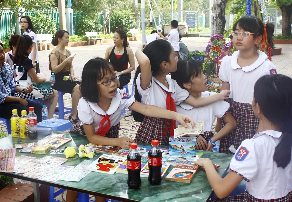 | Bên cạnh đó, hoạt động bán và trao đổi sách tại các quầy hàng trên sân trường cũng thu hút nhiều sự quan tâm. Tại quầy của khối lớp 7, sách được bày bán bao gồm truyện tranh, truyện cổ tích và sách trình bày kỹ năng sống... |