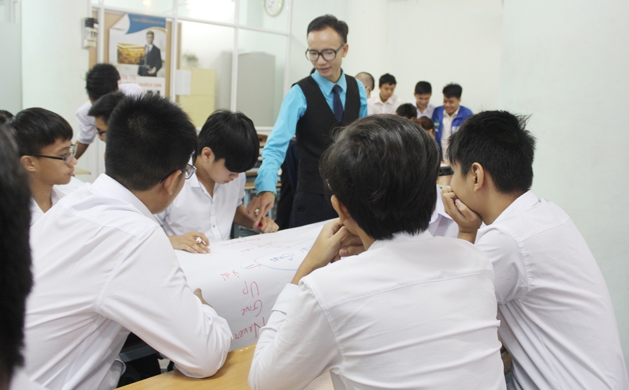 | Diễn giả Huỳnh Anh Bình - Giám đốc Trung tâm Kỹ năng sống TP HCM hướng dẫn phương pháp làm việc nhóm, thuyết trình hiệu quả cho sinh viên Việt Giao. |