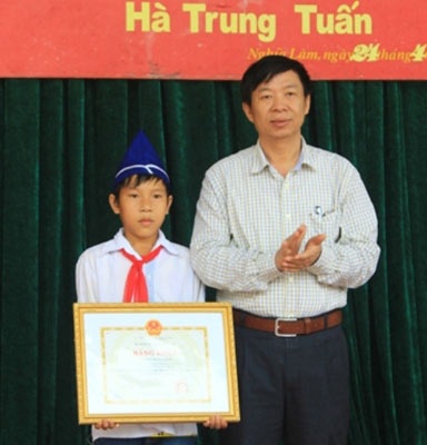 Sáng 24/4, tại trường THCS Lâm Sơn (Nghĩa Đàn, Nghệ An), Sở Giáo dục và Đào tạo Nghệ An tổ chức trao Bằng khen của Bộ cho em Hà Trung Tuấn, học sinh lớp 7B, vì đã có việc làm tốt, khi nhặt được 60 triệu đồng (20 triệu tiền mặt, 40 triệu mã thẻ mua hàng) trả lại cho người bị mất.