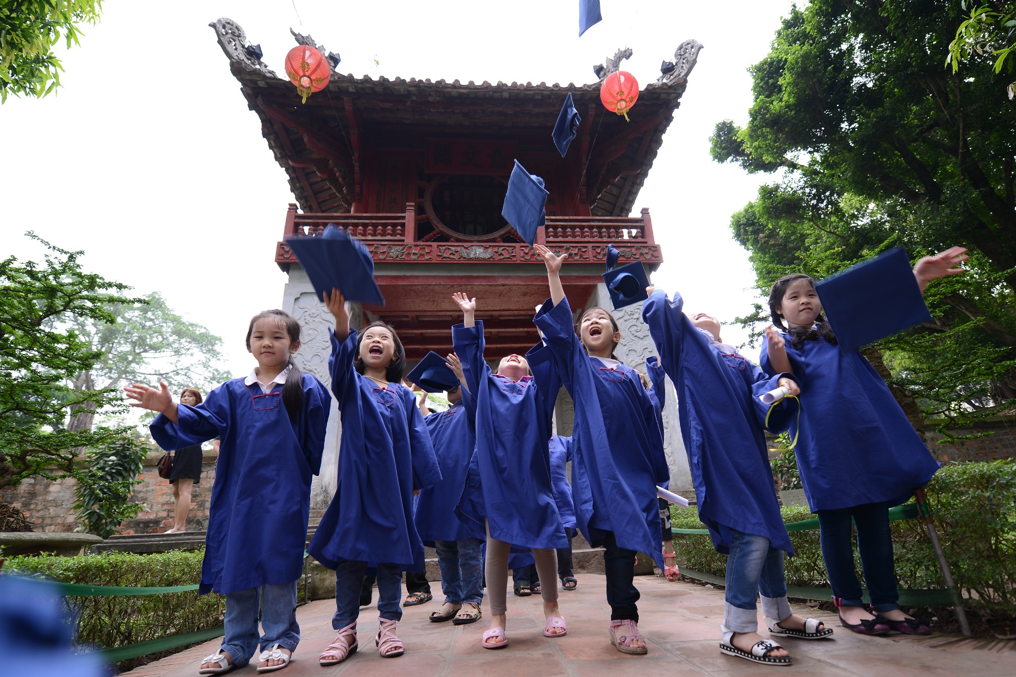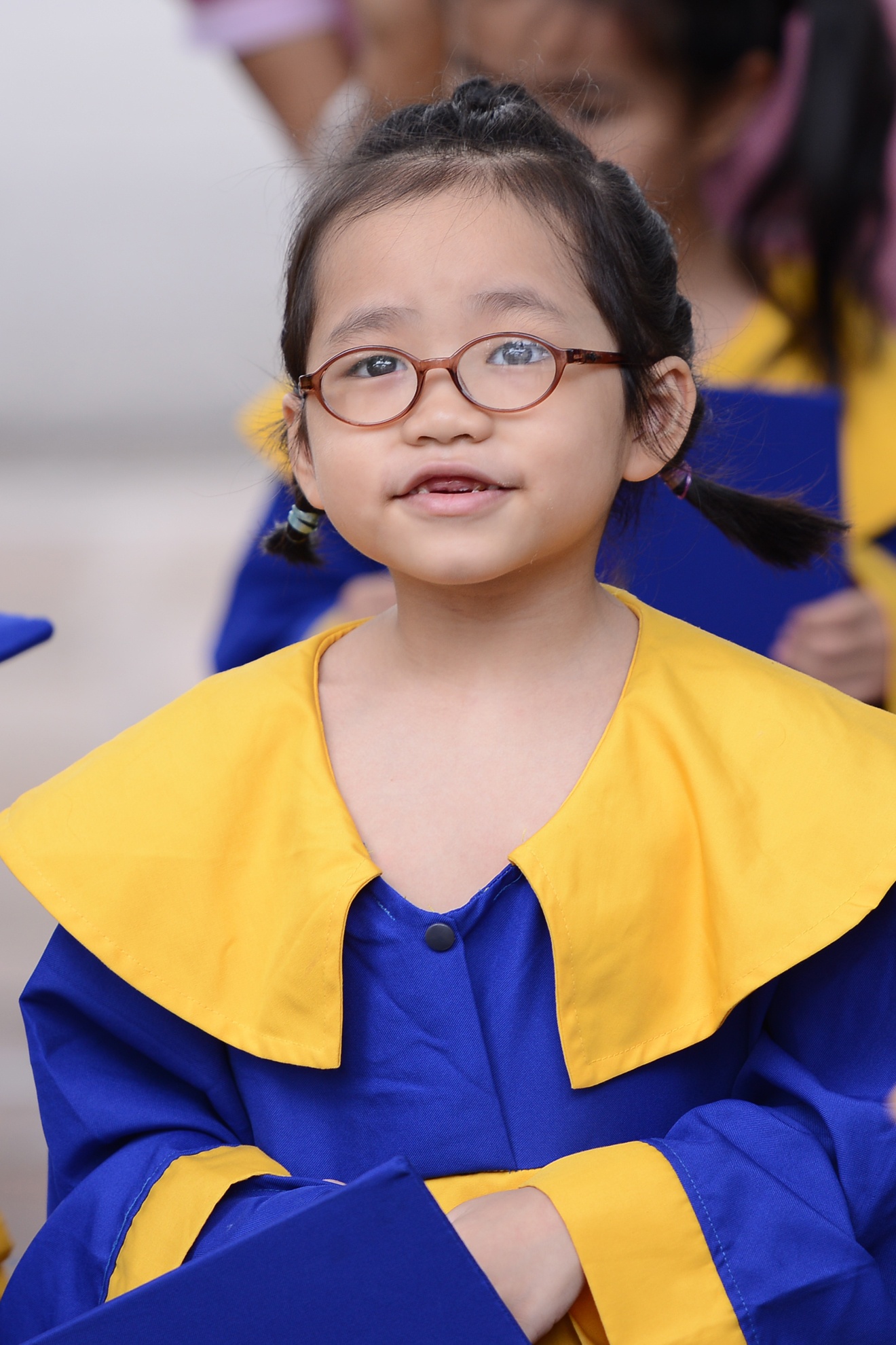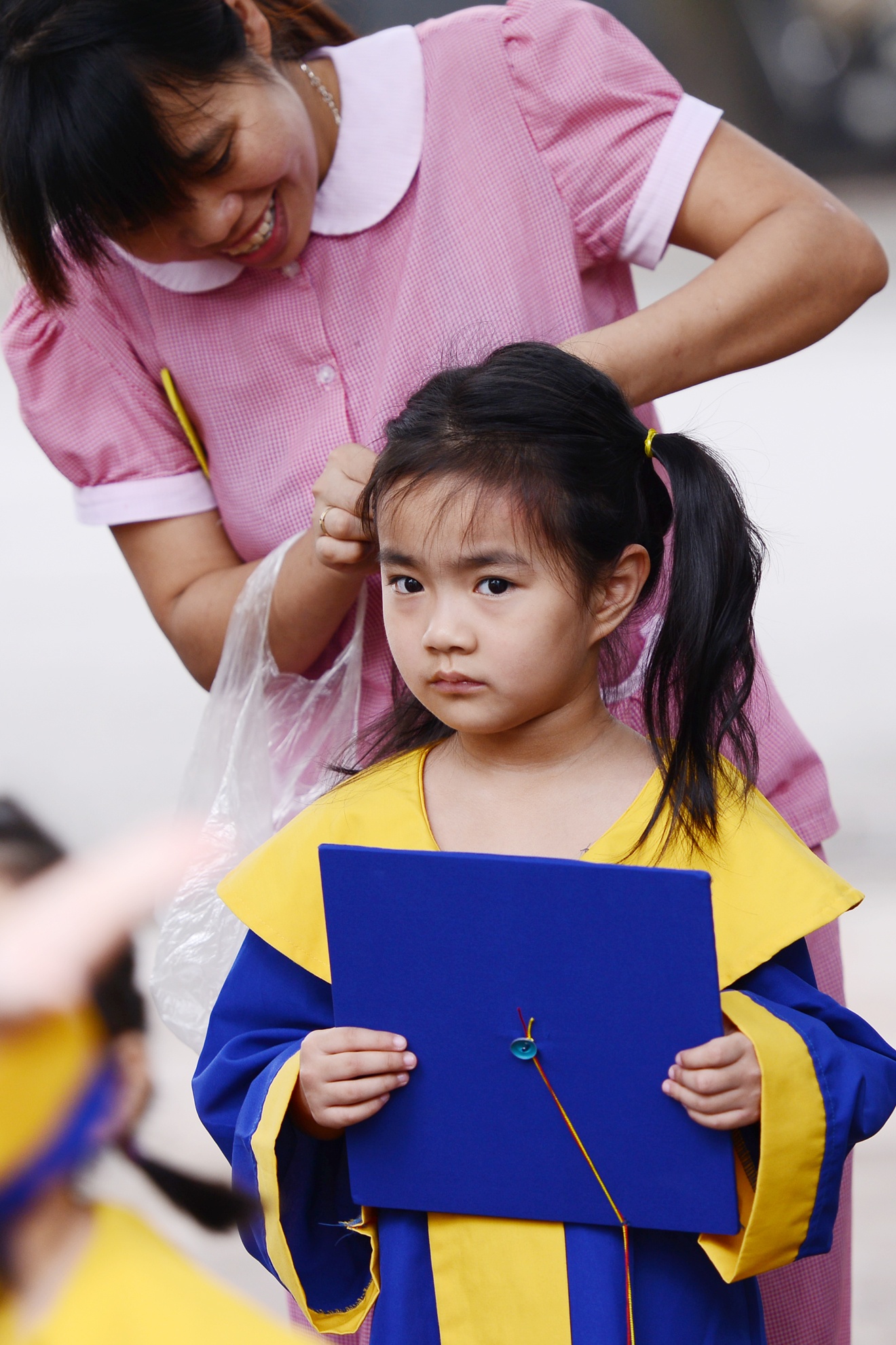 | Các cô cậu nhỏ cũng bắt chước các anh chị sinh viên tung mũ lên cao. Cô giáo của các bé tâm sự; "có thể bây giờ các em còn hồn nhiên chưa hiểu ý nghĩa của thời khắc ý nghĩa này nhưng sau này khi lớn lên nhìn lại các bức hình chắc chắn chúng sẽ rất thích". |