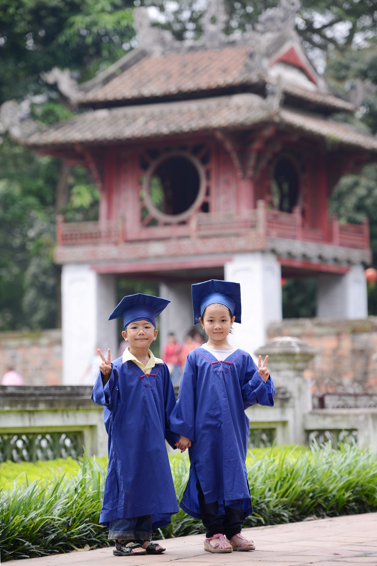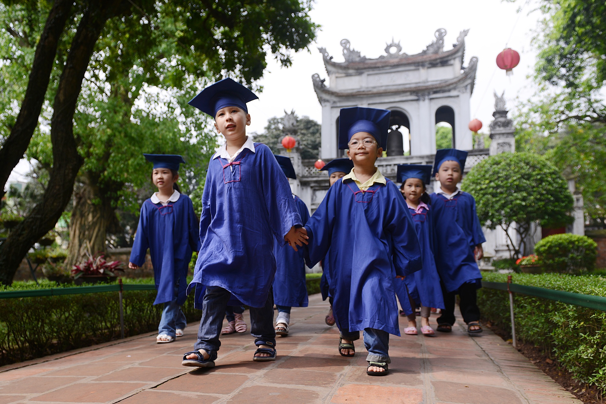 | Sau lễ trao bằng, các bé nắm tay nhau tham quan một vòng khám phá Văn Miếu. |