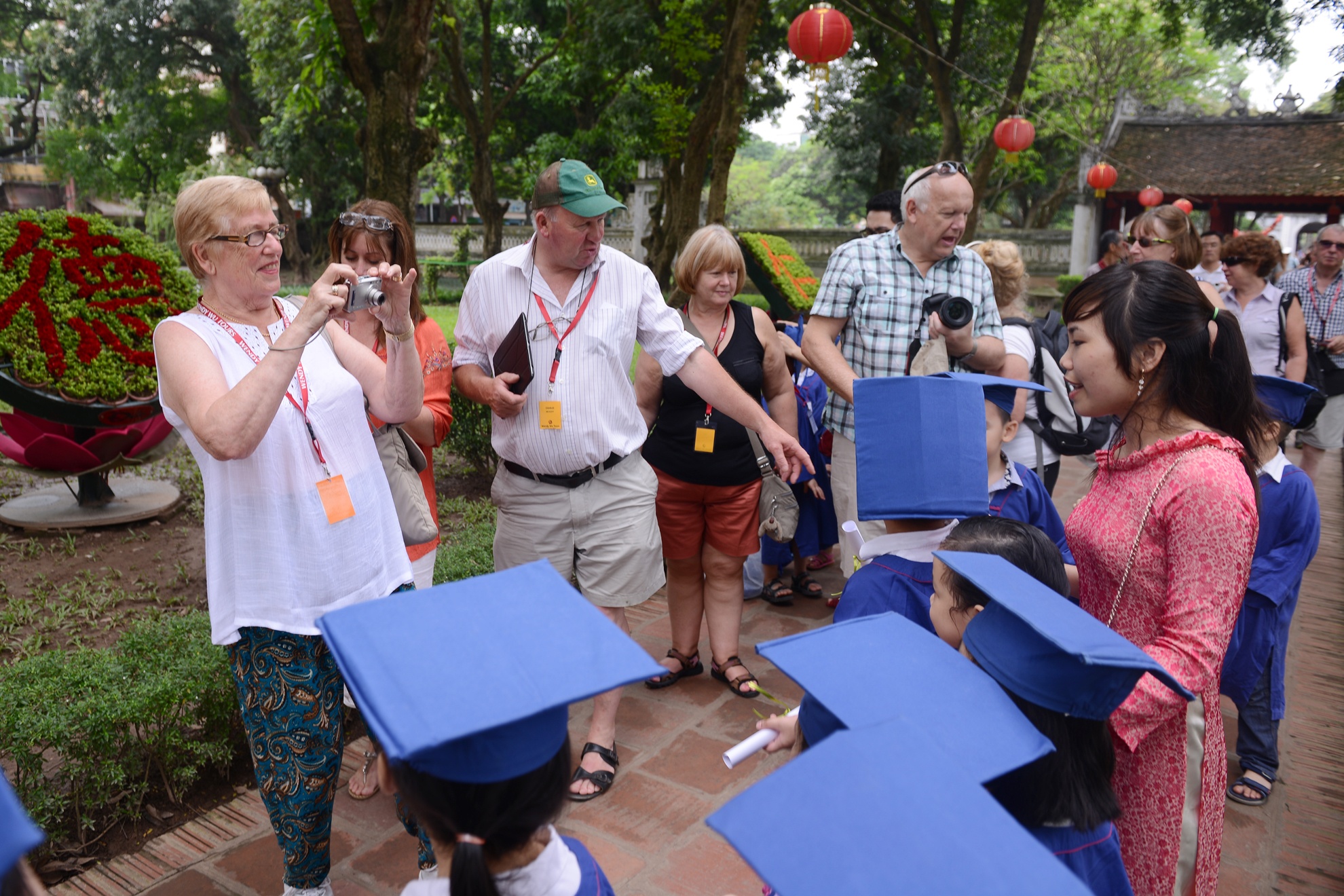 | Du khách nước ngoài thăm Văn Miếu tỏ ra lạ lẫm và thích thú. |