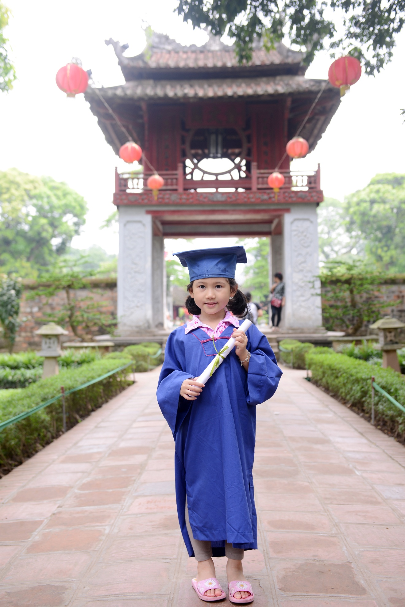 | Mỗi một bé đều được đứng trước Khuê Văn Các, biểu tượng của thủ đô để chụp ảnh lưu niệm cùng giấy chứng nhận tốt nghiệp. |