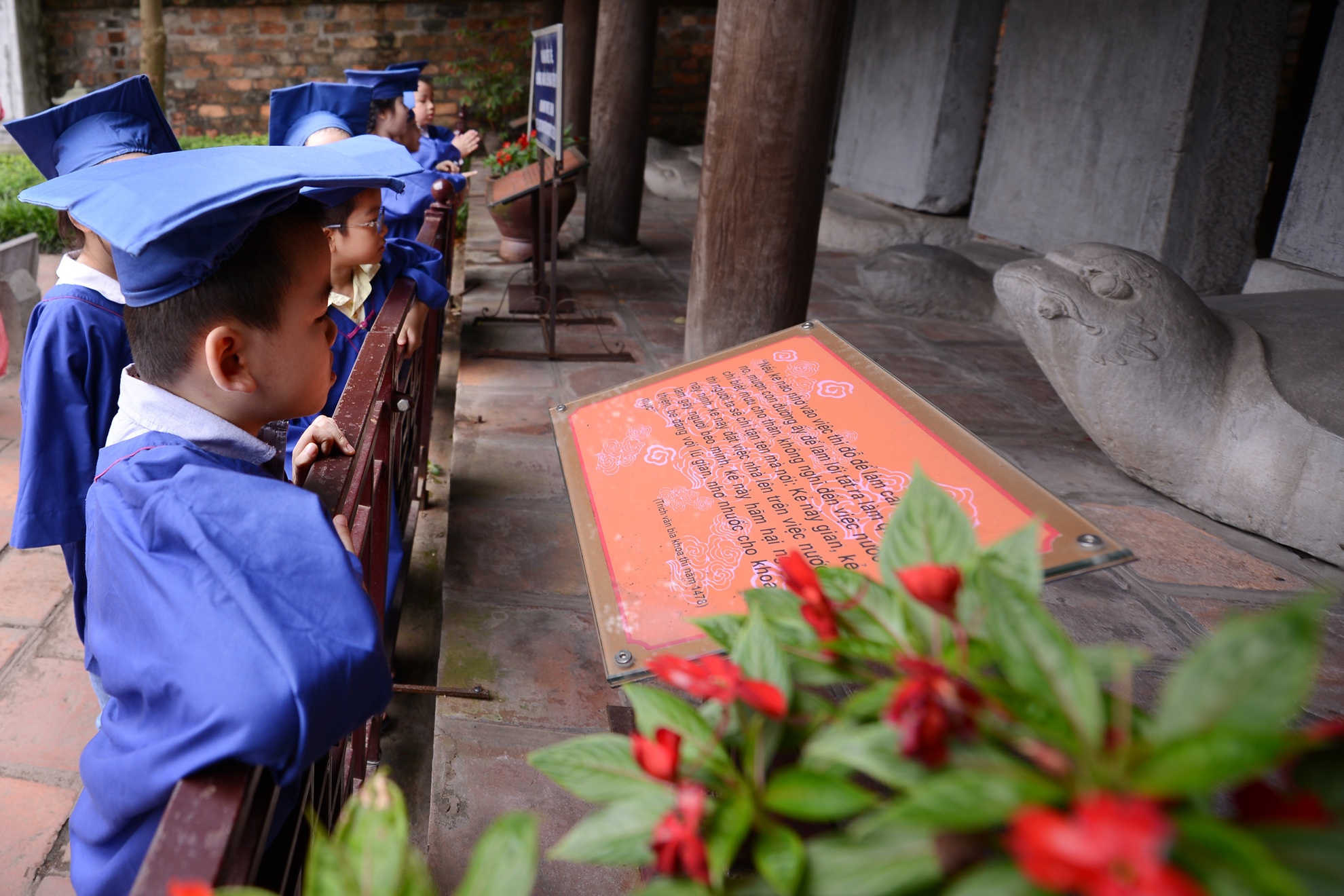 | Dù đã được cô dẫn vào nhiều lần nhưng các bé vẫn dừng lại rất lâu trước các văn bia tiến sĩ, đánh vần đọc bằng hết các dòng chú thích trên biển. |