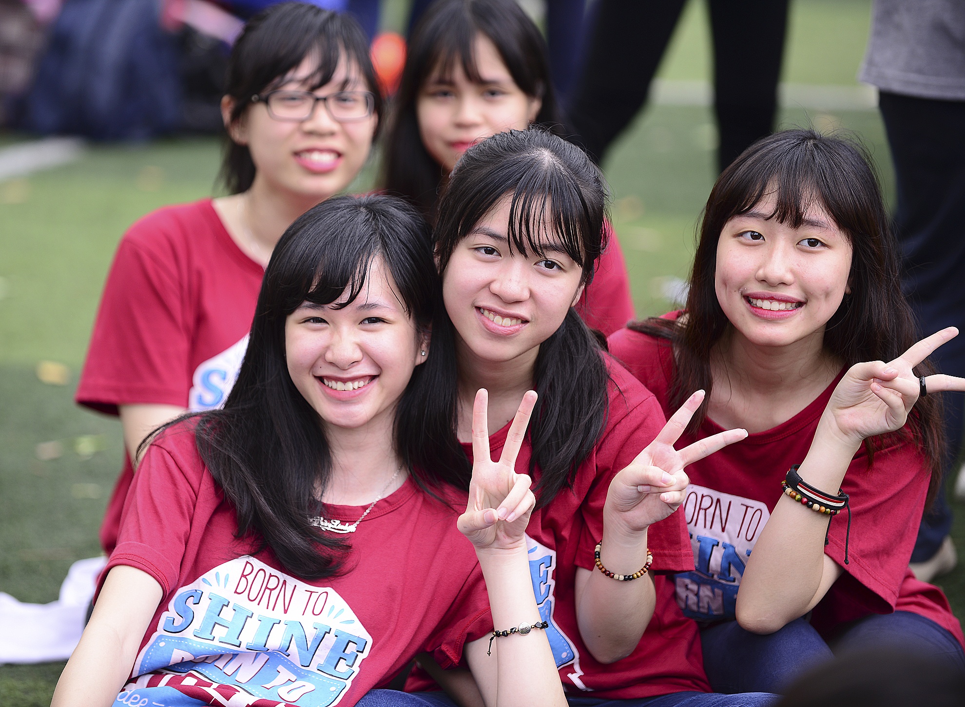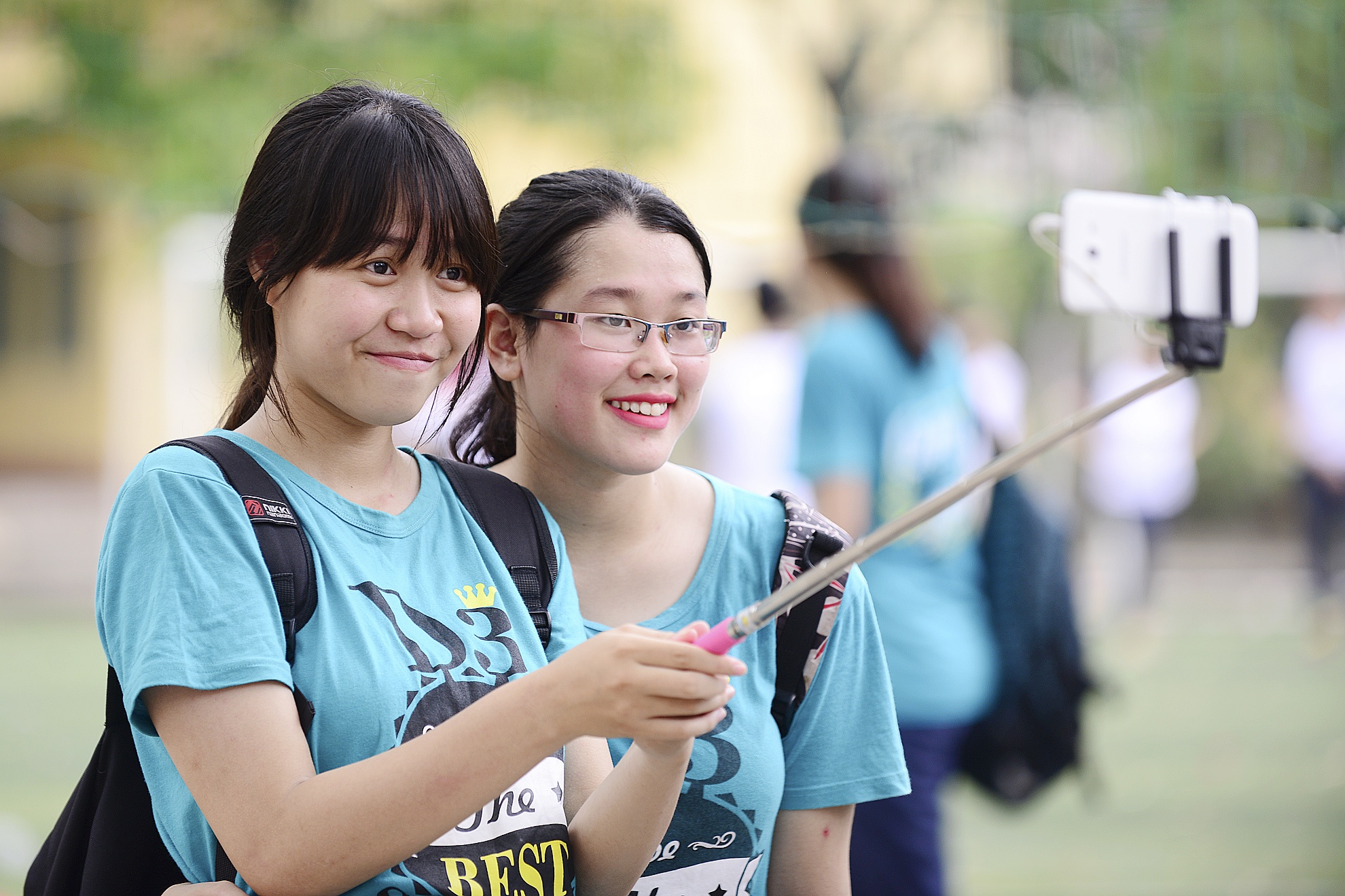 Hai nữ sinh ghi lại khoảnh khắc ngày đặc biệt.