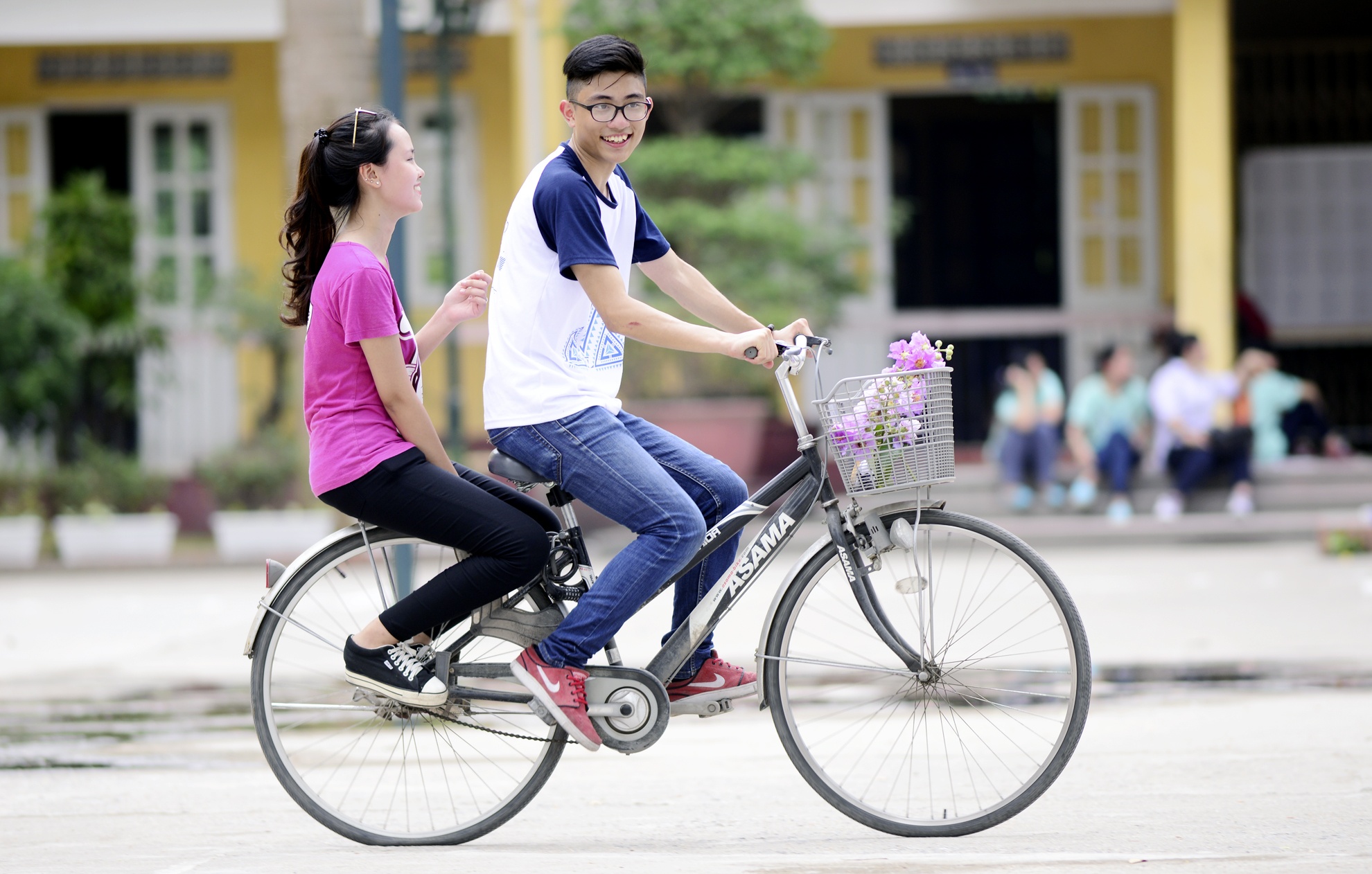 | Nam sinh chở bạn gái trên chiếc xe đạp, giỏ chứa đầy bằng lăng, loài hoa nhắc đến tuổi học trò. |