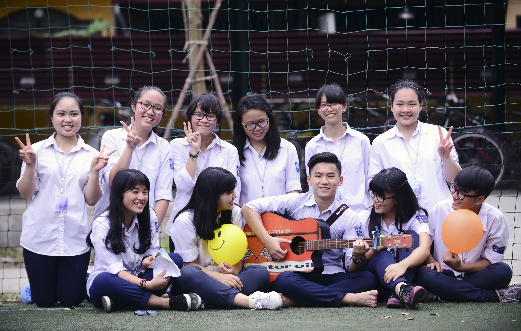 | Khối 11 chơi đàn cổ vũ phía ngoài sân tạo nên không khí vô cùng sôi động, đậm chất học trò. |