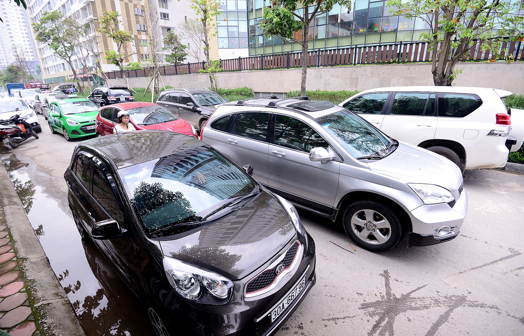 | Nhiều xe đỗ trên vỉa hè, chờ đón thí sinh sau giờ làm bài. |