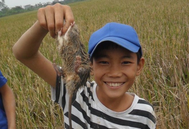 | Trẻ em ở Thái Bình đi bắt chuột. Ảnh Bùi Liên. |