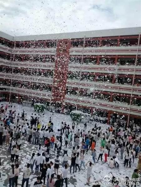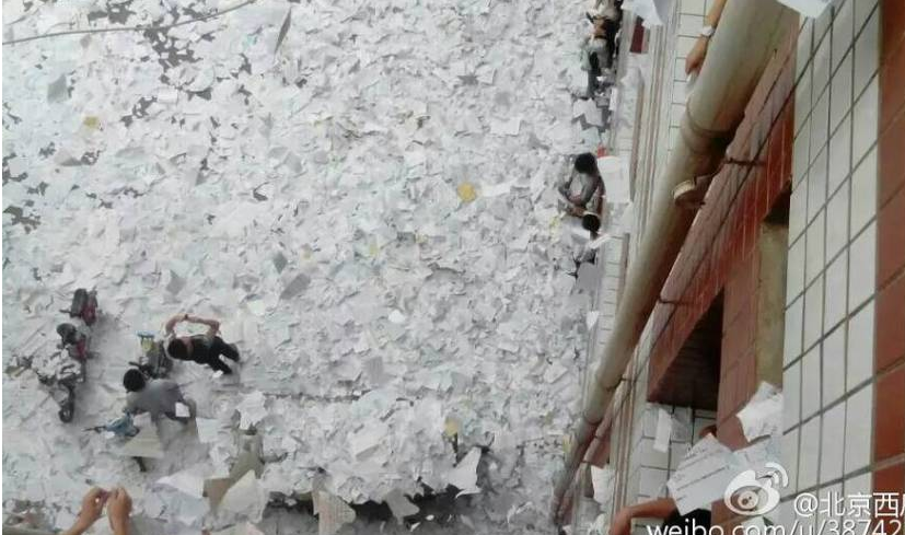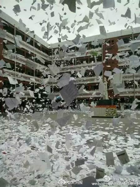| Theo truyền thông địa phương, trước kỳ thi đại học khắc nghiệt (diễn ra ngày 7 và 8/6), học sinh đã rủ nhau xé toàn bộ sách vở để giải tỏa tâm lý căng thẳng, cũng như thể hiện quyết tâm đỗ đại học. |