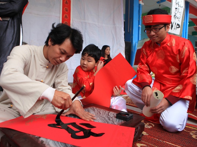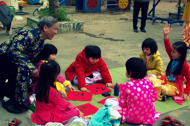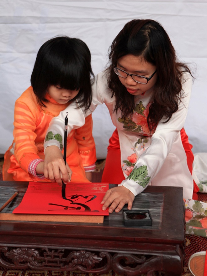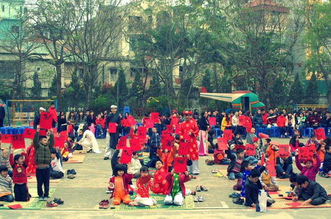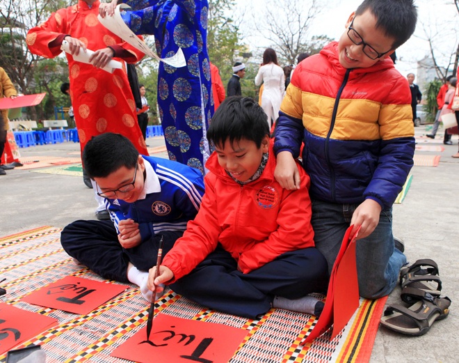| Tái hiện lại hình ảnh xưa với ông đồ, bút nghiên, câu đối, toàn sân trường đã trở thành một lớp học thư pháp. |
