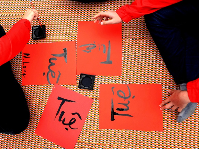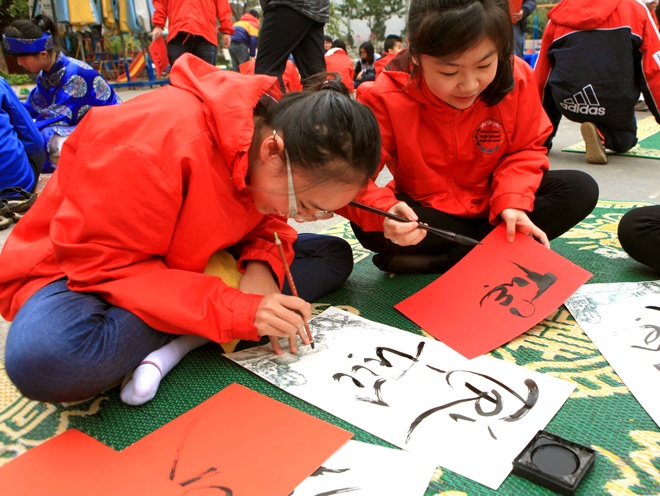 Trên những tờ giấy đỏ thắm, với bút lông, mực mài, hơn 300 học sinh say mê viết tác phẩm thư pháp đầu tay của mình.