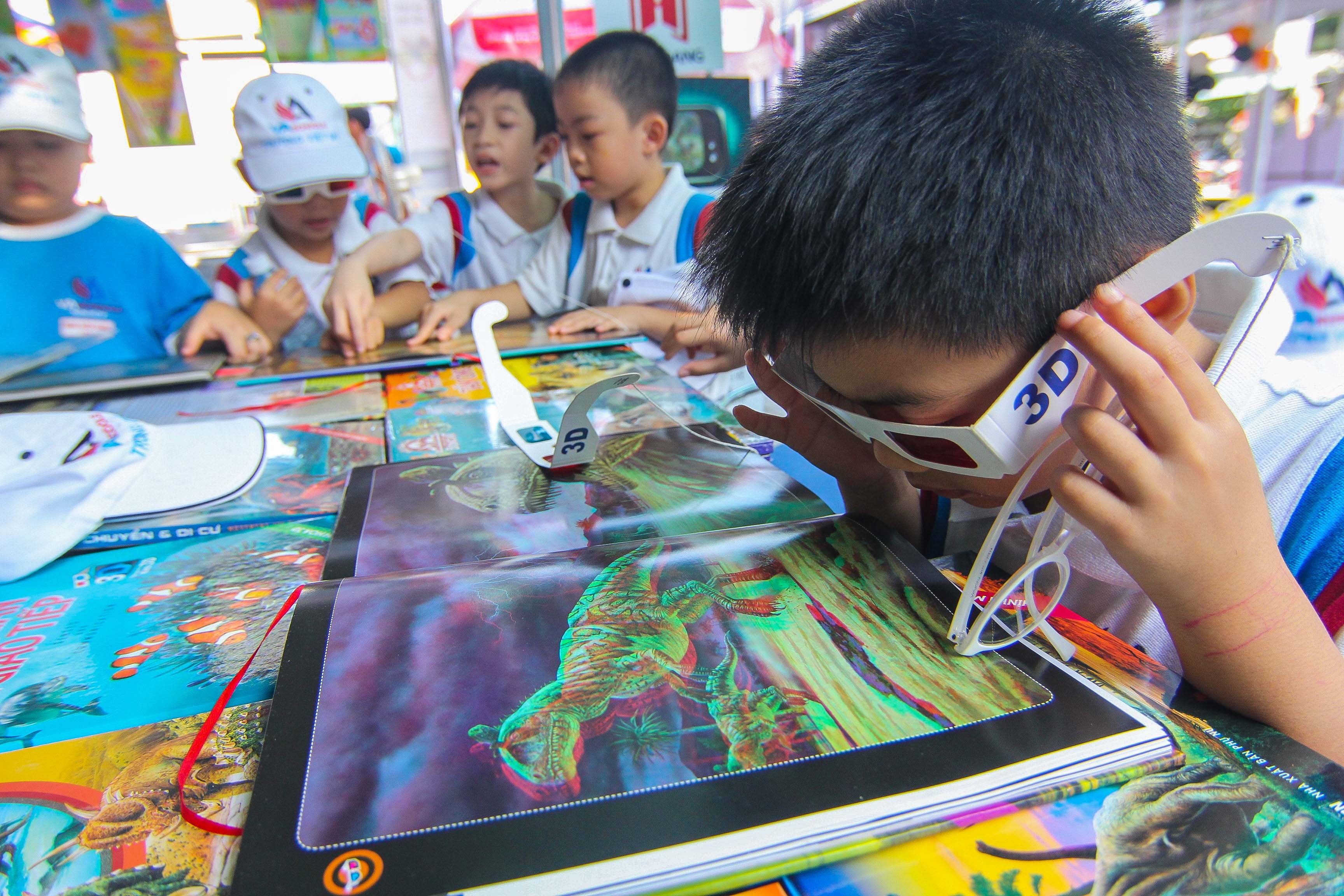 | Bé Trần Thanh Long (lớp 2, trường Việt Mỹ) vẫn xin gia đình mua sách 3D dù bị cận thị, phải nhìn thật gần mới thấy rõ. |