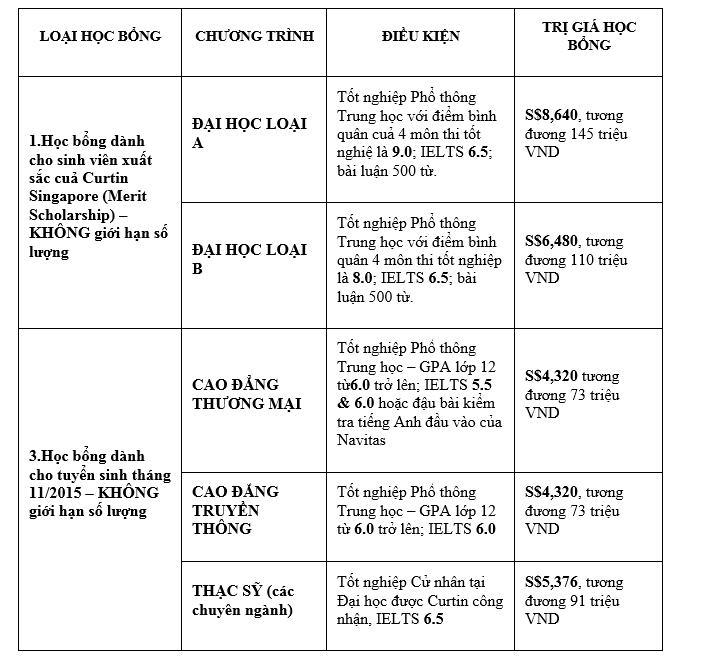 | Trong năm nay, Curtin Singapore cung cấp hàng loạt học bổng du học Singapore lên đến 145 triệu đồng dành cho các học sinh, sinh viên Việt Nam. |