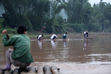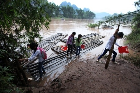 | Học trò thôn Xuân Lũng đi học ngoài chiếc cặp sách, chiếc ghế còn phải mang theo mái chèo để vượt sông. |