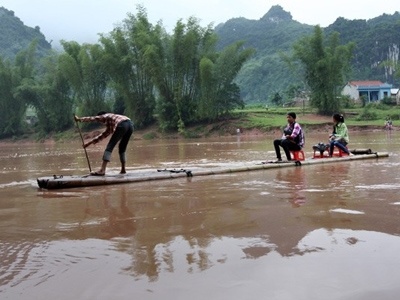 | Phó chủ tịch xã Bình Trung, ông Vi Văn Biên nhà ở thôn Xuân Lũng hàng ngày cũng phải chèo bè đi làm. Giờ đi làm trùng với giờ đến trường của các cháu, ông Biên luôn là người đưa các học sinh sang sông. |